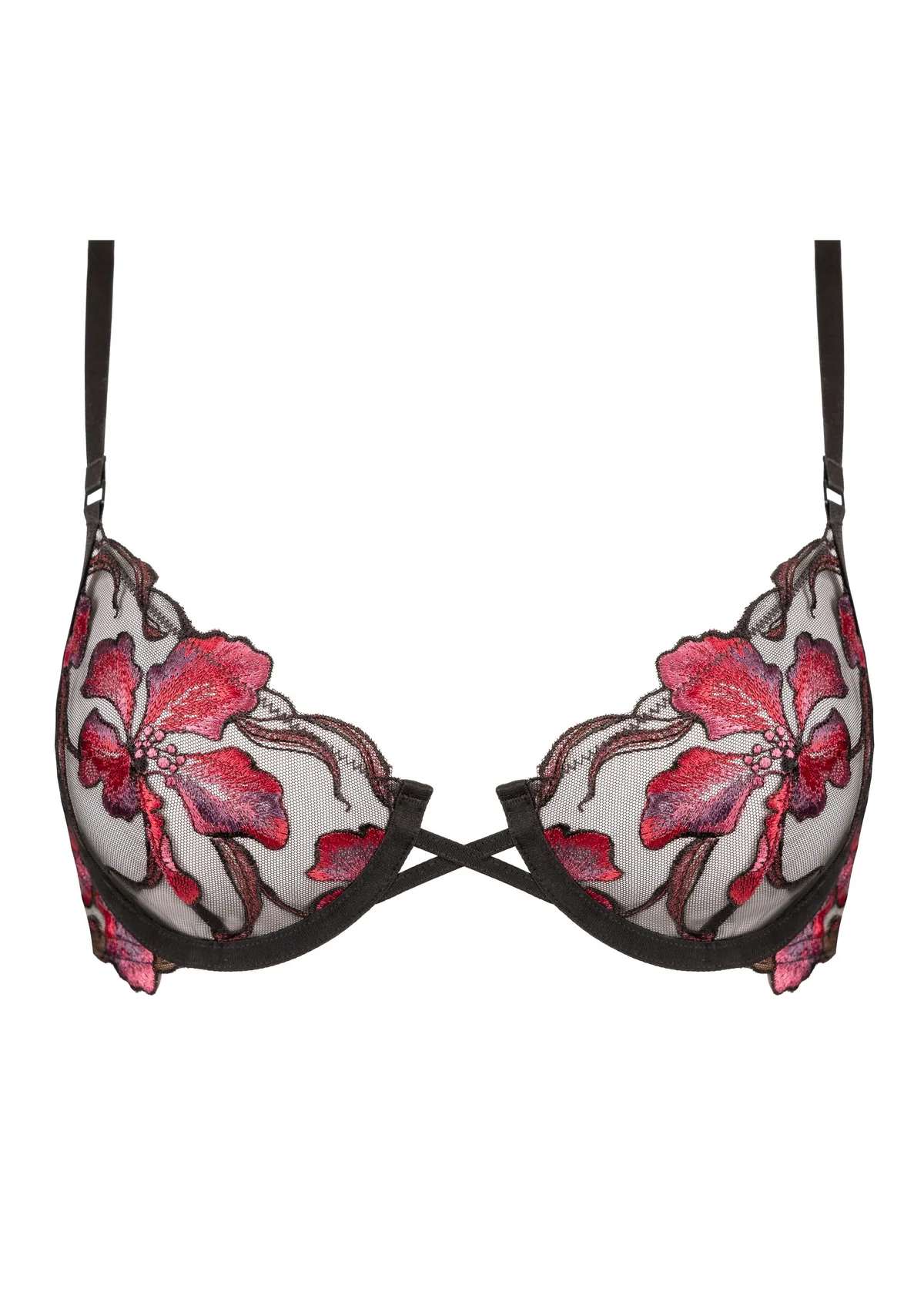 De Half Cup Bra Dernier Frisson is ontworpen voor een rond, vol decolleté. De cups zijn uitgevoerd in multicolore floral broderie en het midden van de borst is voorzien van een kruislings geplaatste band voor een subtiel sensueel effect.