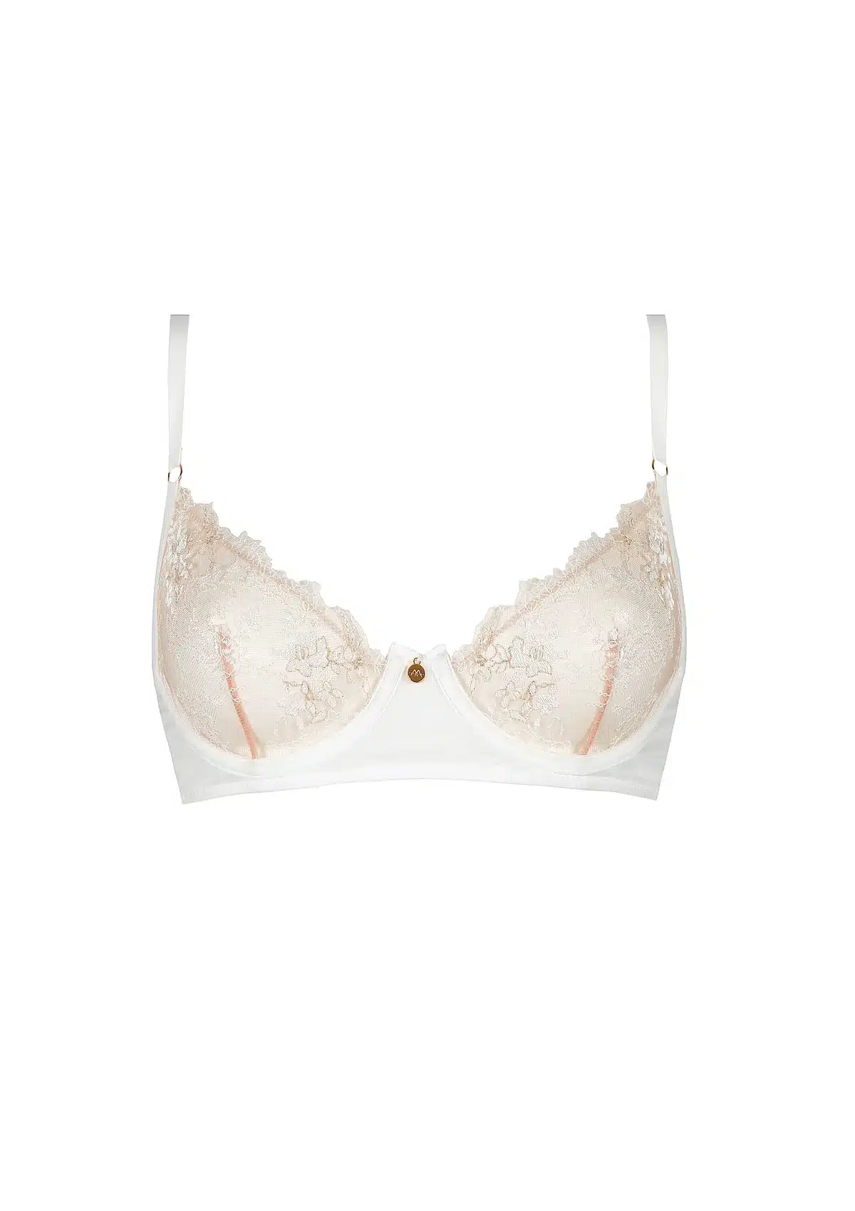 De Après Minuit Pearl Corbeille Beha combineert klassieke elegantie met moderne verfijning. De demi-cup beugelbeha is volledig geborduurd met delicate ivoorkleurige bloemen op een huidkleurige basis, waardoor het decolleté subtiel en stijlvol wordt benadrukt.