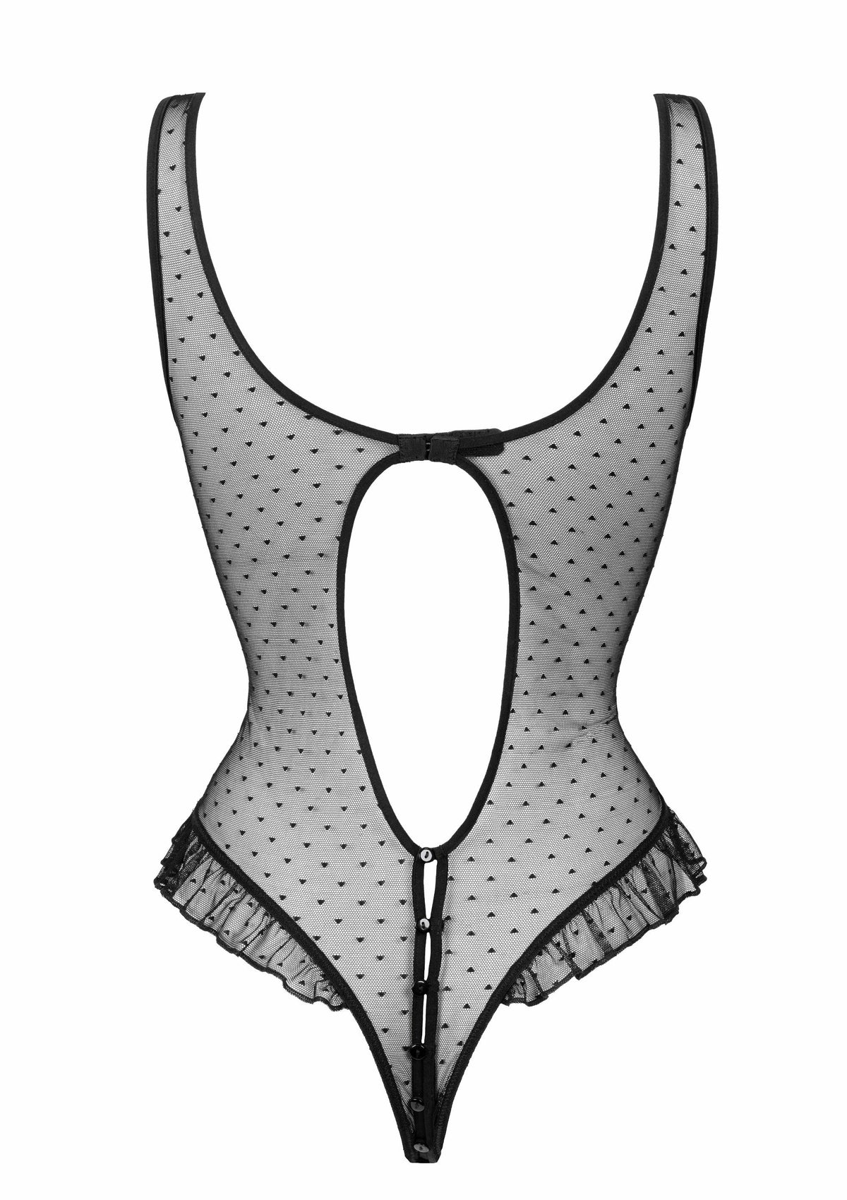 Delicate ruches ter hoogte van de heupen voegen een charmante retro-touch toe, terwijl de rij kleine knoopjes aan de voorzijde het oog sensueel naar beneden leidt. Het open kruisontwerp versterkt het gedurfde karakter van deze body en nodigt uit tot speelse momenten, zonder in te boeten aan elegantie.
