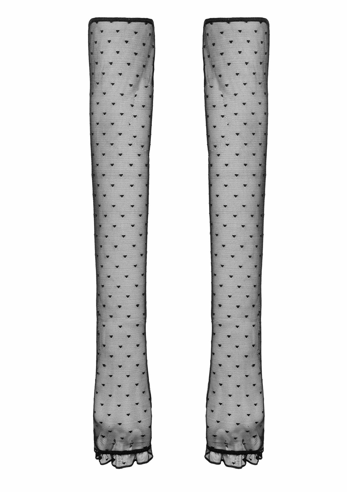 Uitgevoerd in luchtig plumetis-tule met verfijnde stippen creëren deze lange handschoenen een subtiel spel van transparantie dat de armen op sierlijke wijze omlijst.