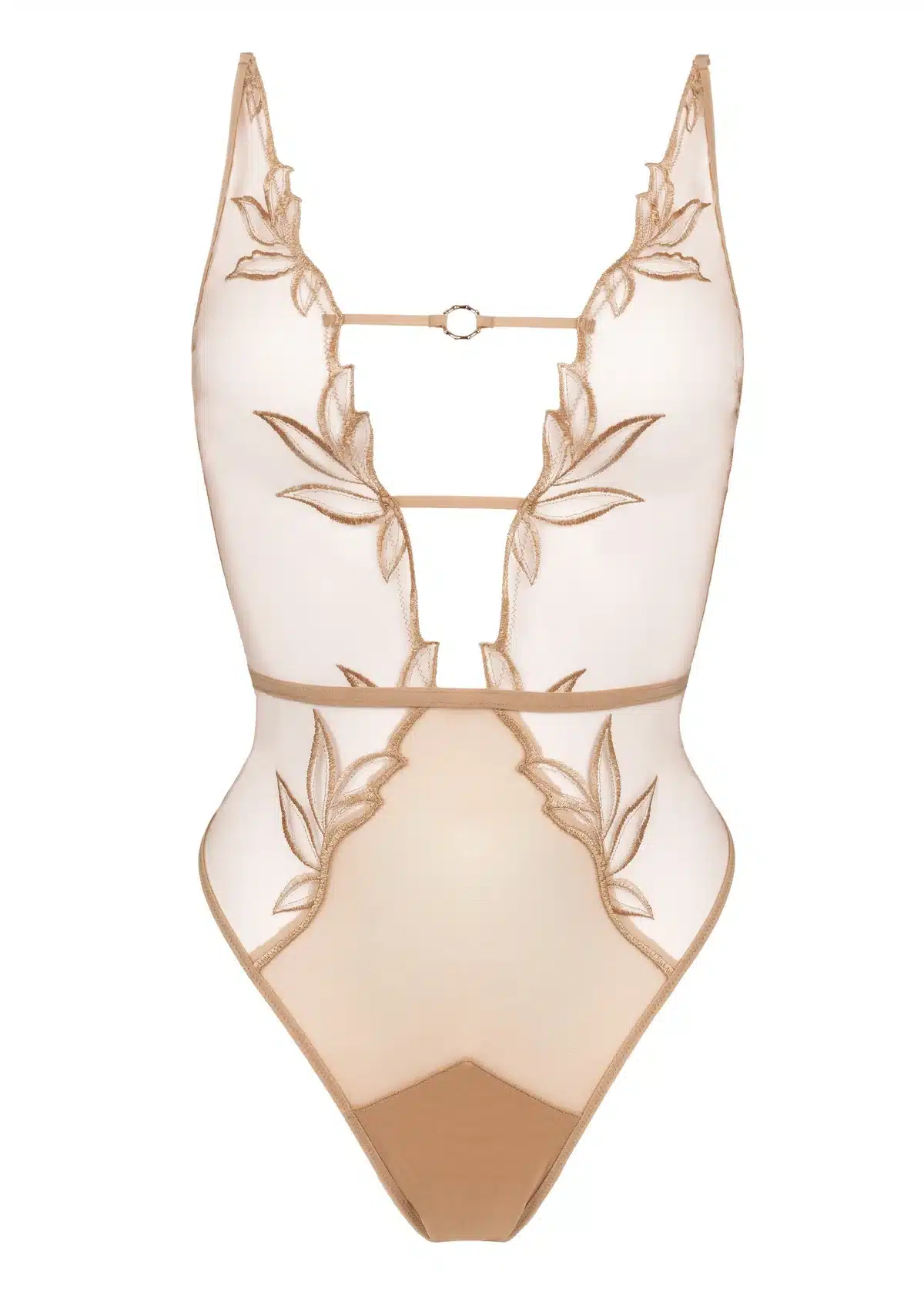 Het lichaam wordt omhuld door zacht, transparant tule dat een spel van licht en silhouet creëert. Gedurfde cut-outs brengen spanning en moderniteit, terwijl het grafische botanische borduurwerk de rondingen elegant omlijst. Deze variant is uitgevoerd in de elegante DUNE-tint, een warme lichaamskleur die het ontwerp een extra verfijnde uitstraling geeft.