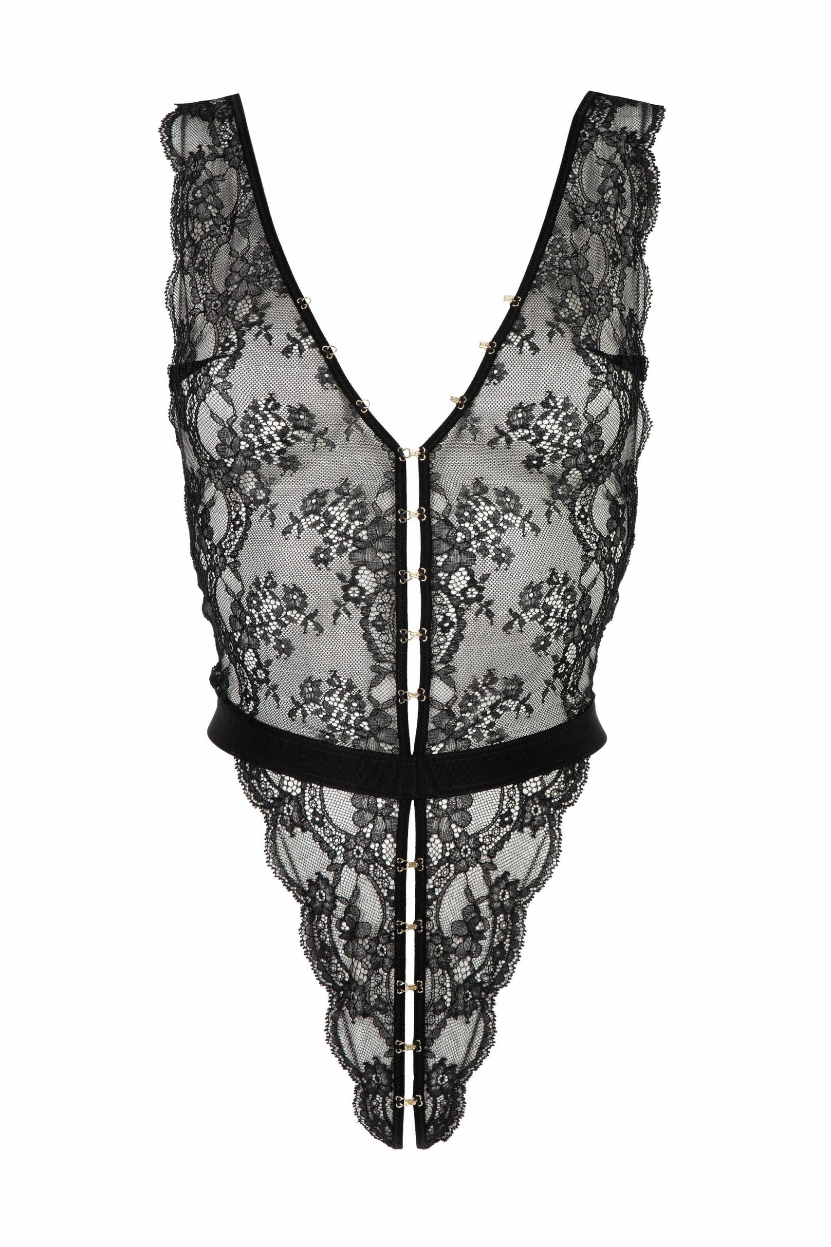 Deze body is volledig uitgevoerd in verfijnde kant en heeft een diep uitgesneden decolleté dat de buste krachtig en verleidelijk omlijst. De opening van boven tot onder met kleine goudkleurige haakjes creëert niet alleen een visueel statement, maar voegt ook een speels, luxueus element toe aan het ontwerp.