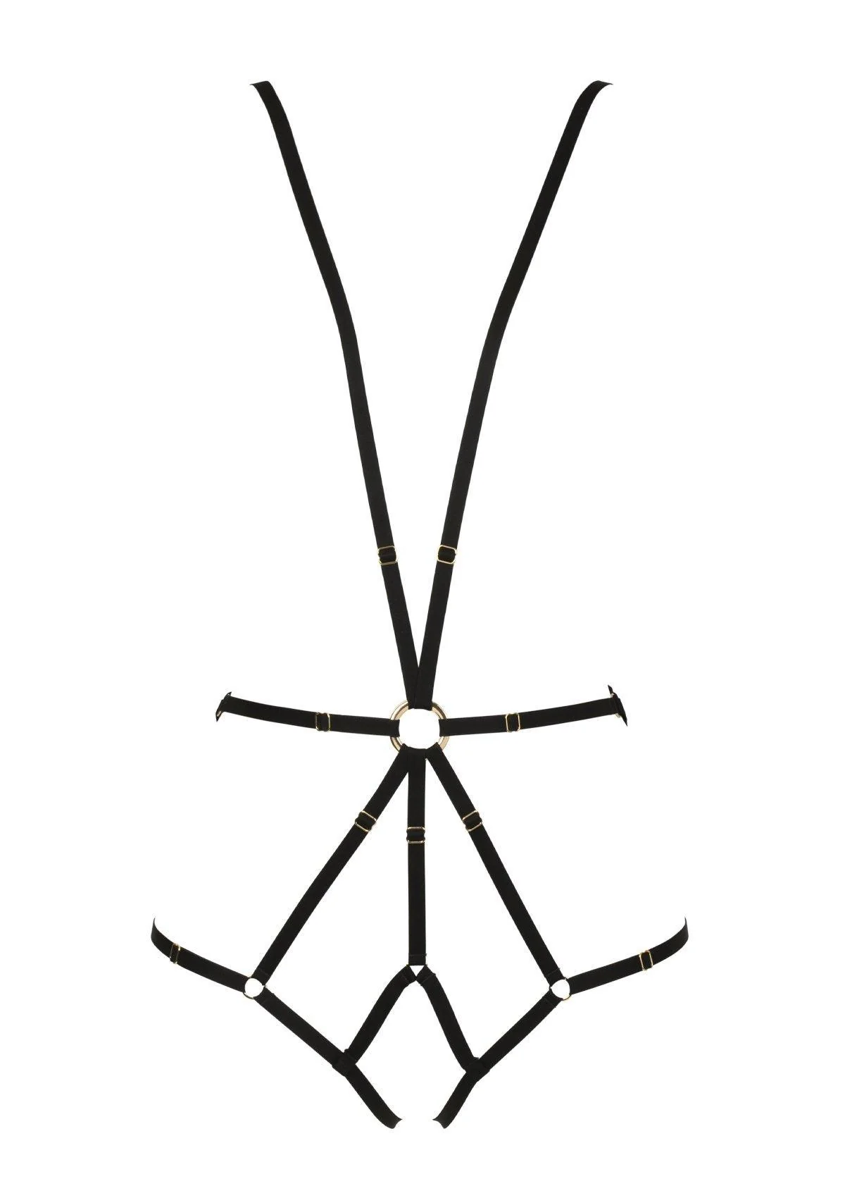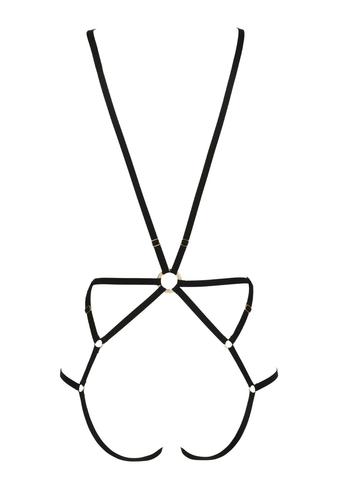 Dit harnas is volledig elastisch en verstelbaar, zodat het zich perfect vormt naar je silhouet en je vormen subtiel accentueert. De grote gouden ringen geven het harnas een chique, originele uitstraling en maken het tot een opvallend statement piece. Het harnas kan solo worden gedragen voor een sensuele look of gecombineerd worden met andere stukken uit de Insoutenable Légèreté-collectie voor een gelaagde, verfijnde styling.