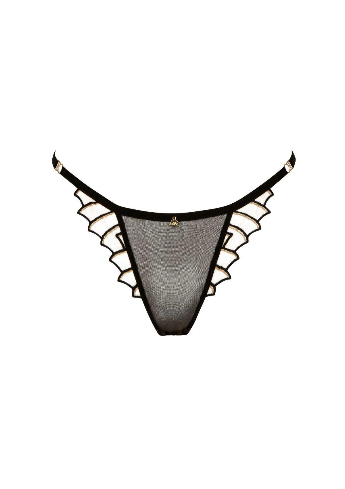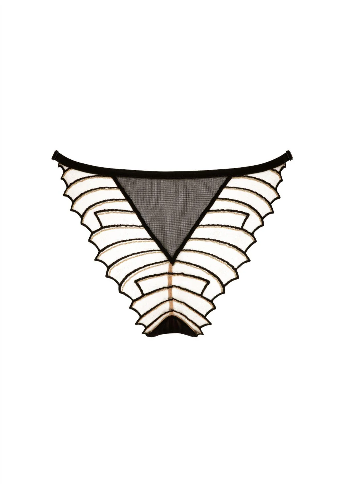 De Slip Cosmic Dream is een elegant en verleidelijk lingerie-item dat transparantie en comfort perfect combineert. De slip is uitgevoerd in zwarte, zachte tule en verrijkt met grafisch borduurwerk met koperkleurige reflecties, wat zorgt voor een subtiele glans op de huid.