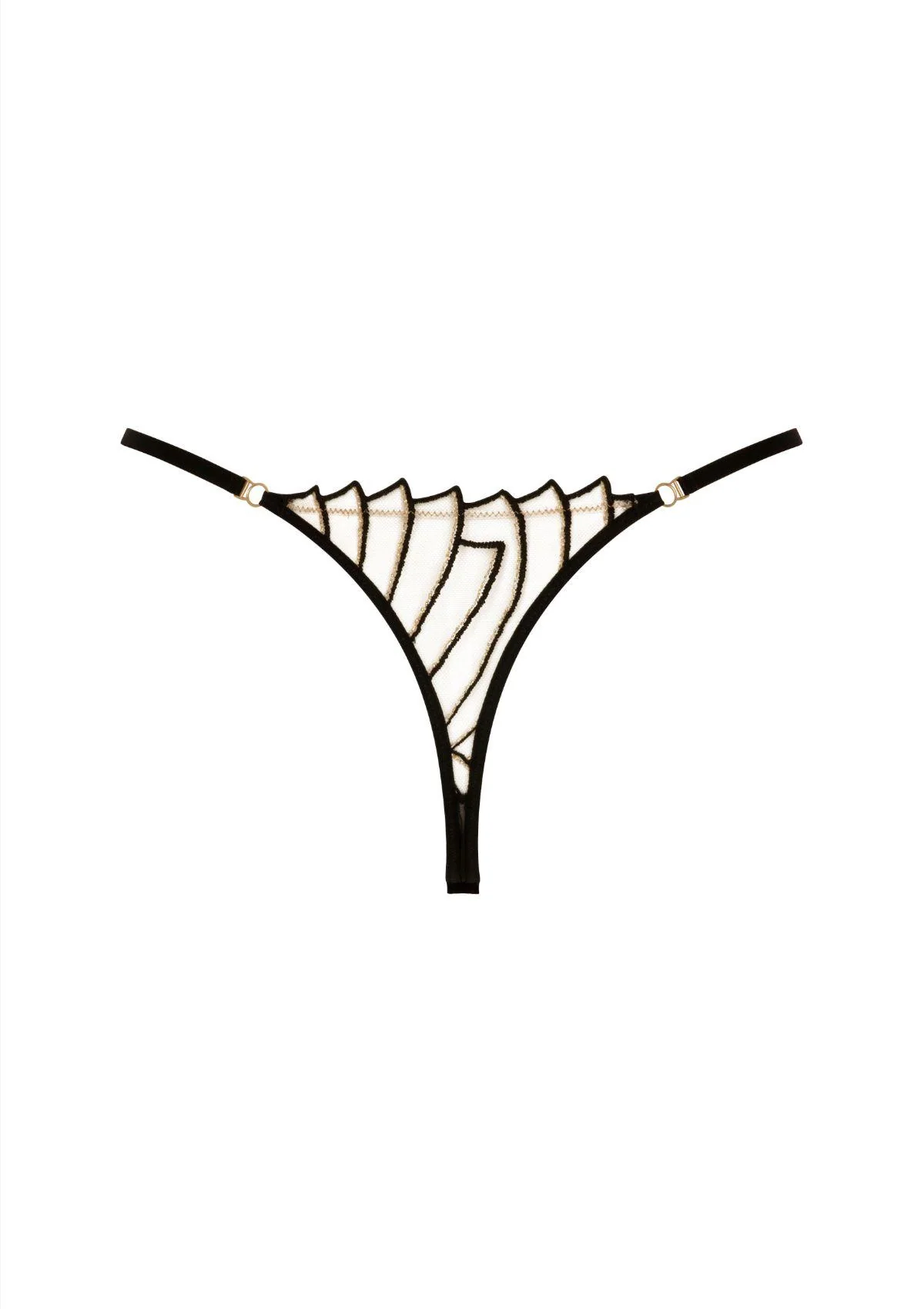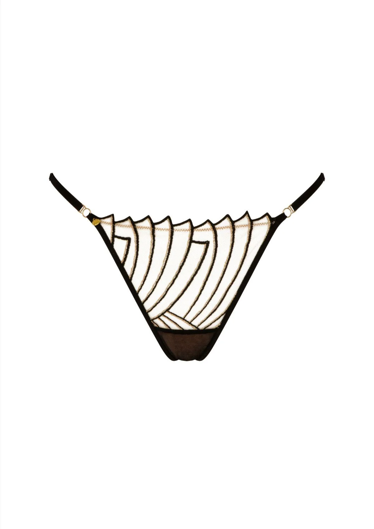 Aan de zijkanten zorgen verstelbare, elastische bandjes voor een perfecte pasvorm, afgewerkt met koperkleurige sierdetails voor een luxueuze touch. Het minimalistische ontwerp biedt weinig bedekking, terwijl het toch comfortabel blijft dankzij het zachte, rekbare tule inzetstuk bij het kruis.