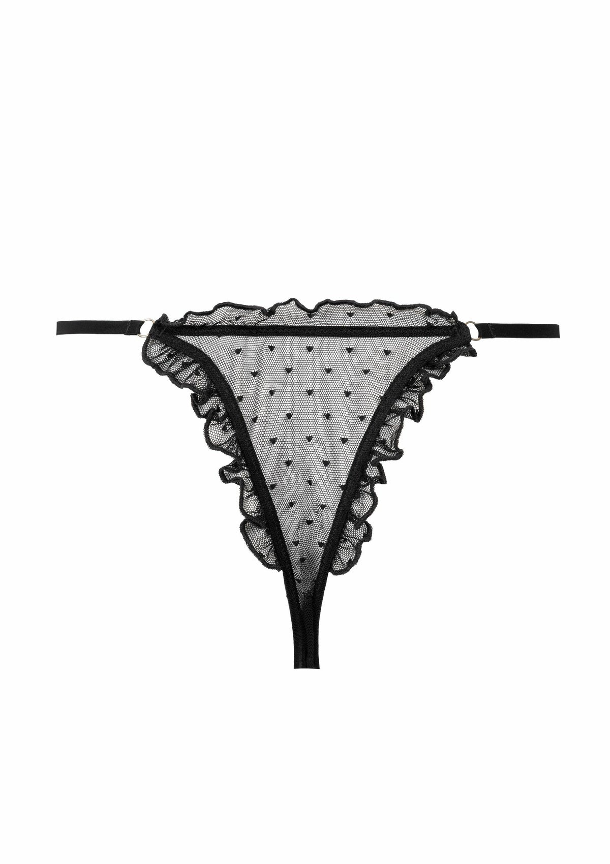 Het ontwerp is uitgevoerd in luchtig plumetis-tule dat zacht over de huid valt en een verfijnde transparantie biedt. De delicate ruches geven de string een speels, vrouwelijk accent en zorgen voor een onweerstaanbaar charmante uitstraling.