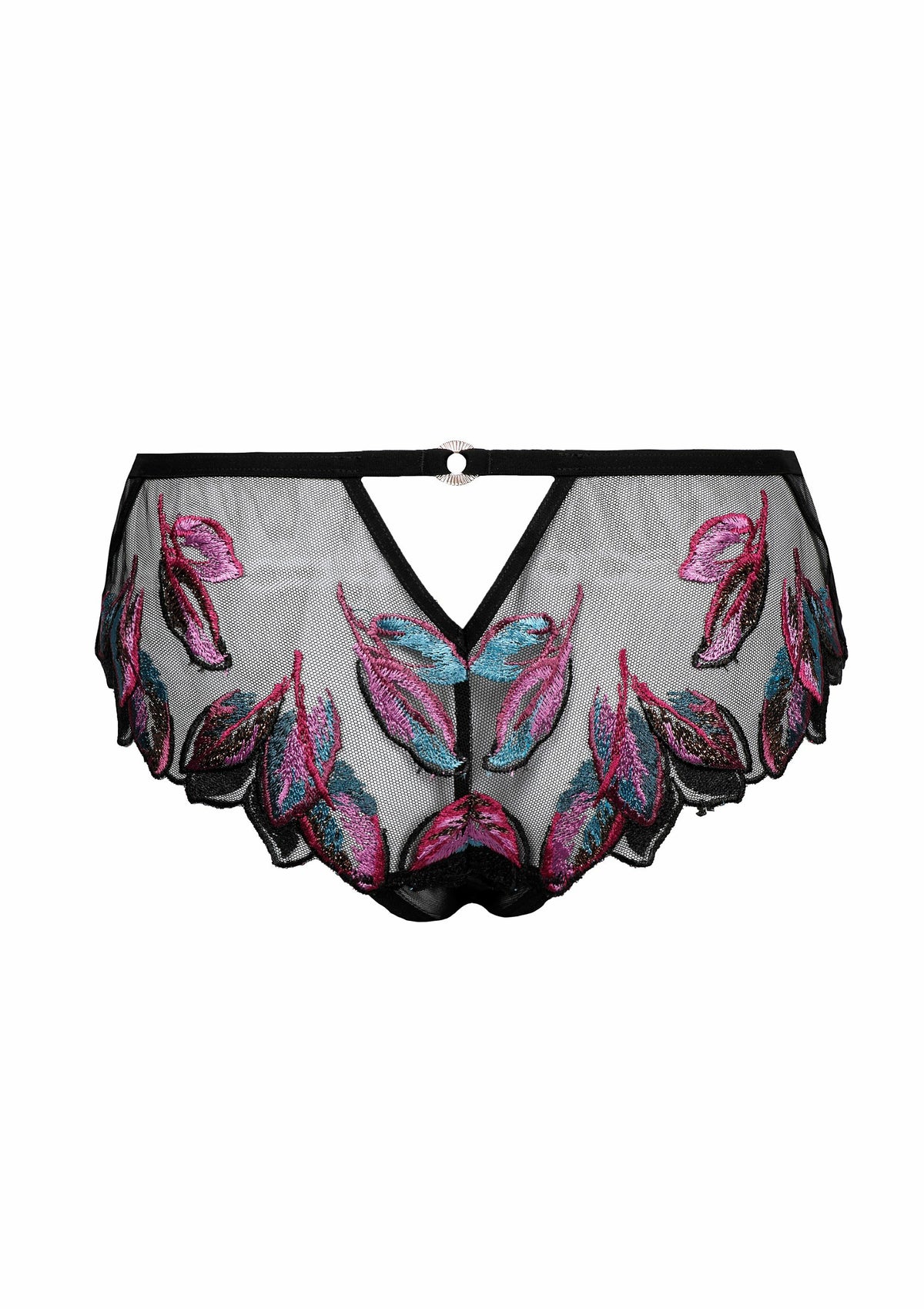 De Shorty Oiseau de Paradis is een verfijnd lingerie-item dat transparantie en multicolore borduursel prachtig samenbrengt. De voorzijde is uitgevoerd in een combinatie van zacht tulle en borduurwerk, terwijl de achterkant volledig geborduurd is, wat een luxueuze en elegante uitstraling geeft.
