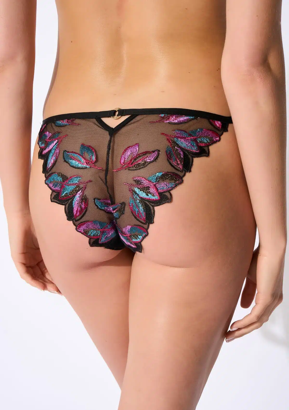 De Slip Oiseau de Paradis combineert comfort en verleiding met transparant tulle, multicolore broderie en verfijnde goudkleurige details.